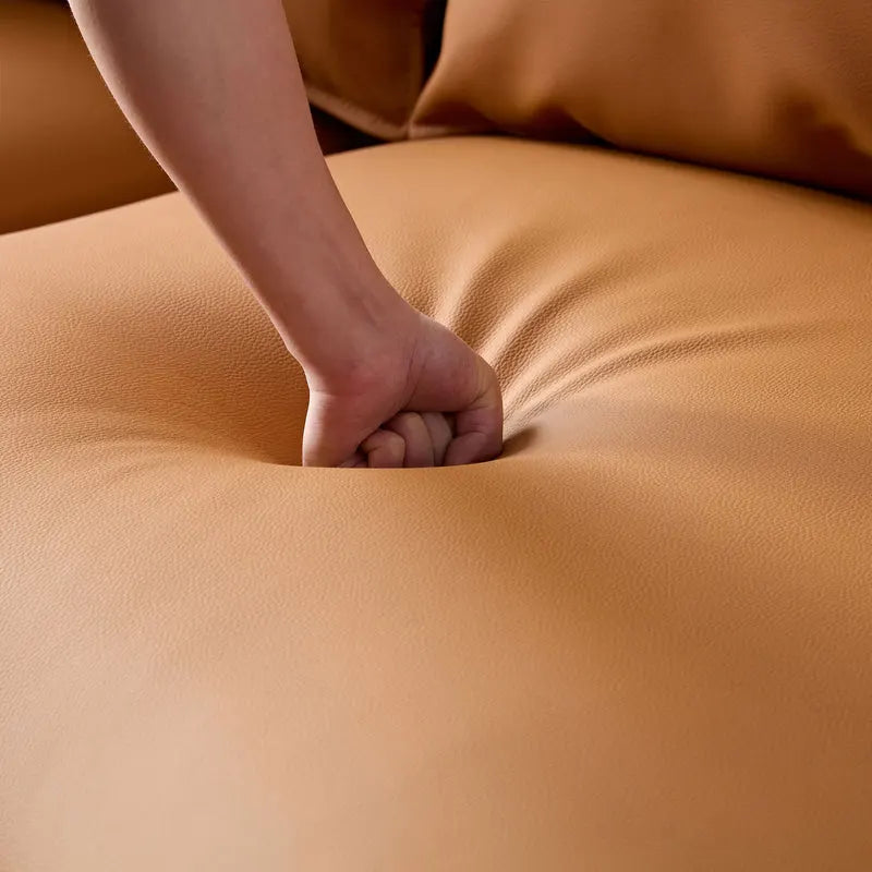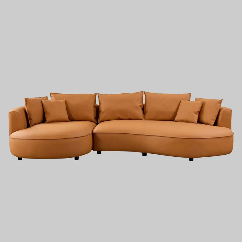 The Dakota Sofa is a bold expression of modern comfort and sculptural design. Featuring a distinctive curved silhouette, this spacious five-seater offers generous support and an inviting presence for contemporary living spaces. Upholstered in soft eco-leather or shearling sherpa and available in camel orange or white, Dakota delivers a refined balance of style and durability. High-density foam cushions, elastic spring support, and a sturdy wood frame provide lasting comfort, while thoughtfully designed pillows enhance everyday relaxation. Effortlessly elegant and easy to assemble, the Dakota Sofa is designed to anchor your space with comfort and character.