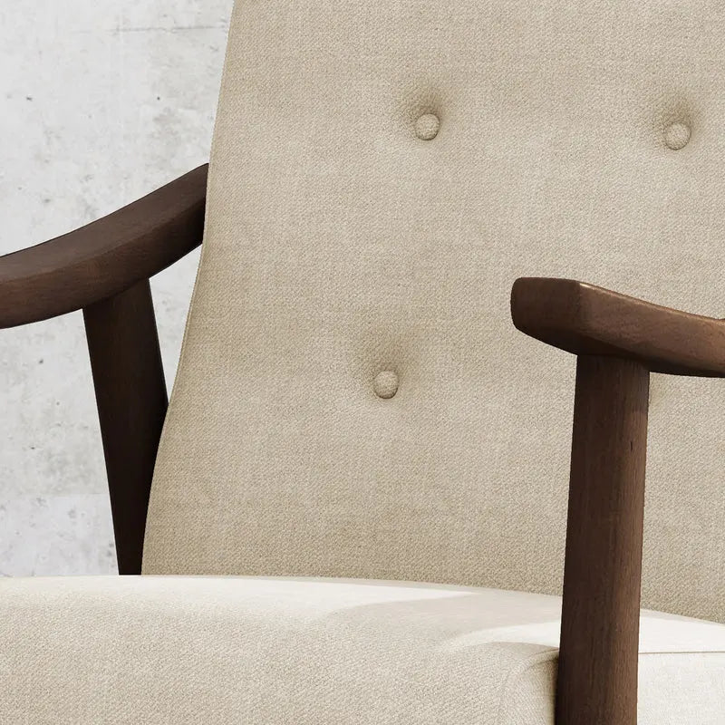 - Immerse yourself in mid-century modern style with this sleek and trendy sofa. Featuring chic button tufting and iconic bent-wood arms, it adds a touch of retro flair to any living space. The fabric upholstery enhances its timeless appeal, making it a standout piece in your home. Update your decor with this classic design and bring a vibrant brilliance to your interior.
