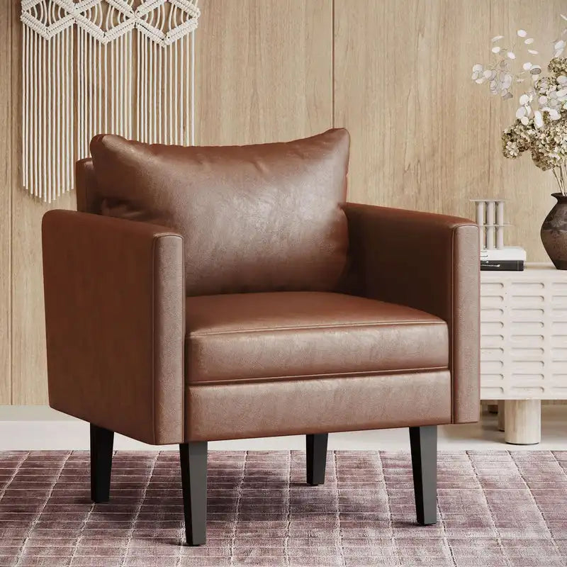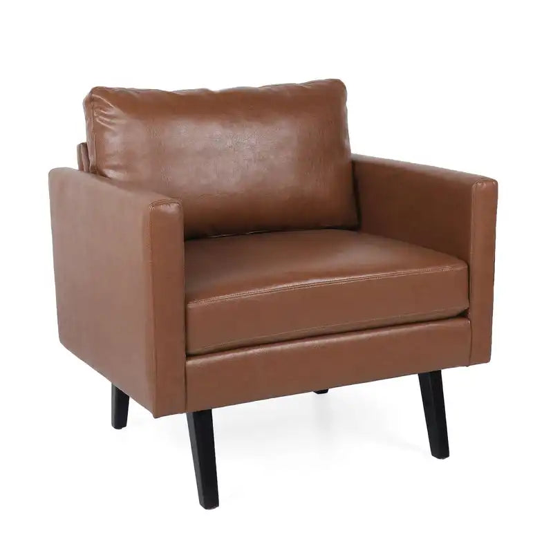 - Lend style to your interior space with a sophisticated retro aesthetic. Featuring a rich mid-century modern style with delightful faux leather upholstery and beautifully tapered legs, our club chair offers your decor a stunning upgrade that will surely have all your guests talking. Whether you are looking for a place to settle down with a good book or need a place to curl up and relax, this chair brings you the best in comfort and design for you to enjoy.